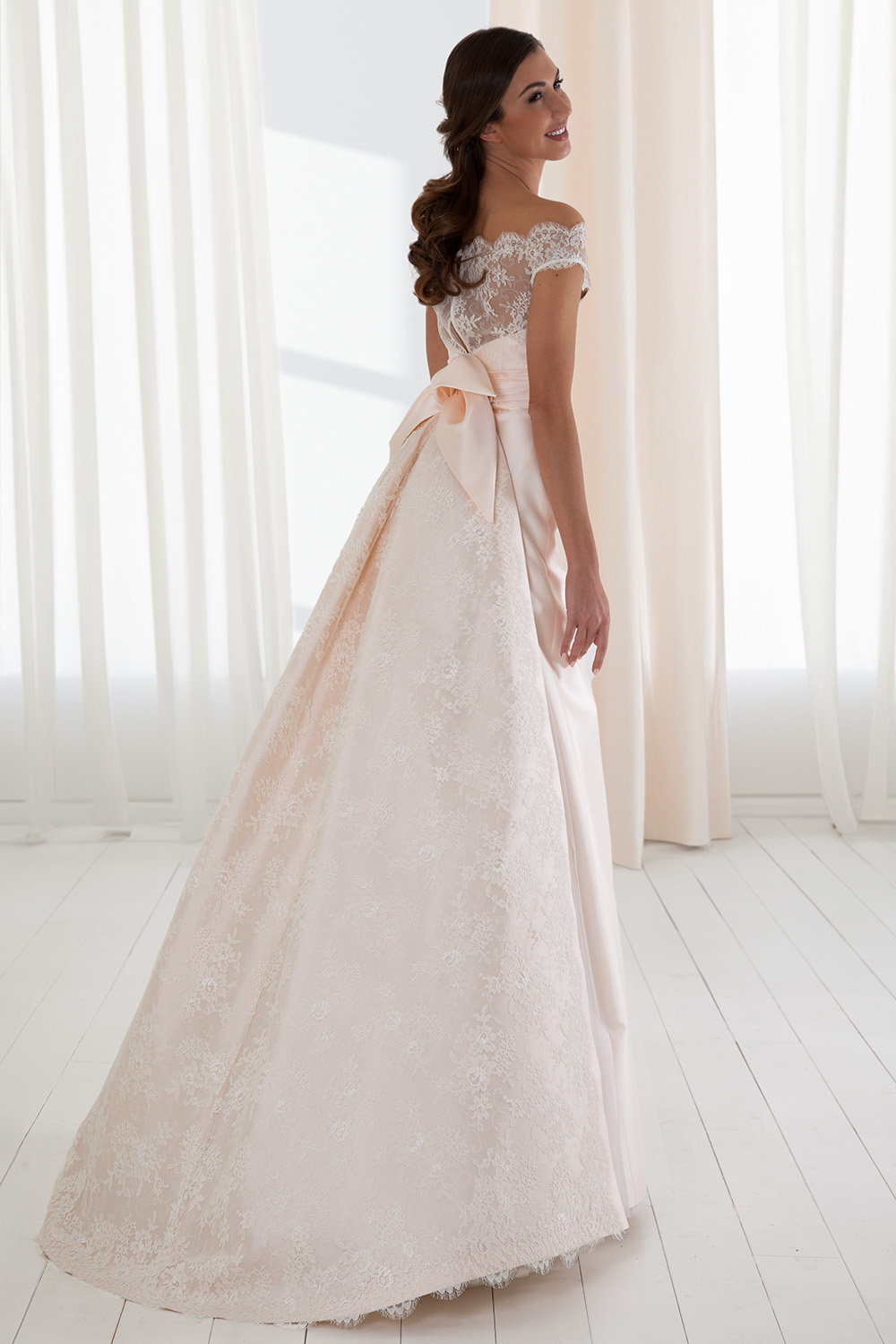L’ampia coda ed il corpino sono ricoperti di pizzo chantilly.