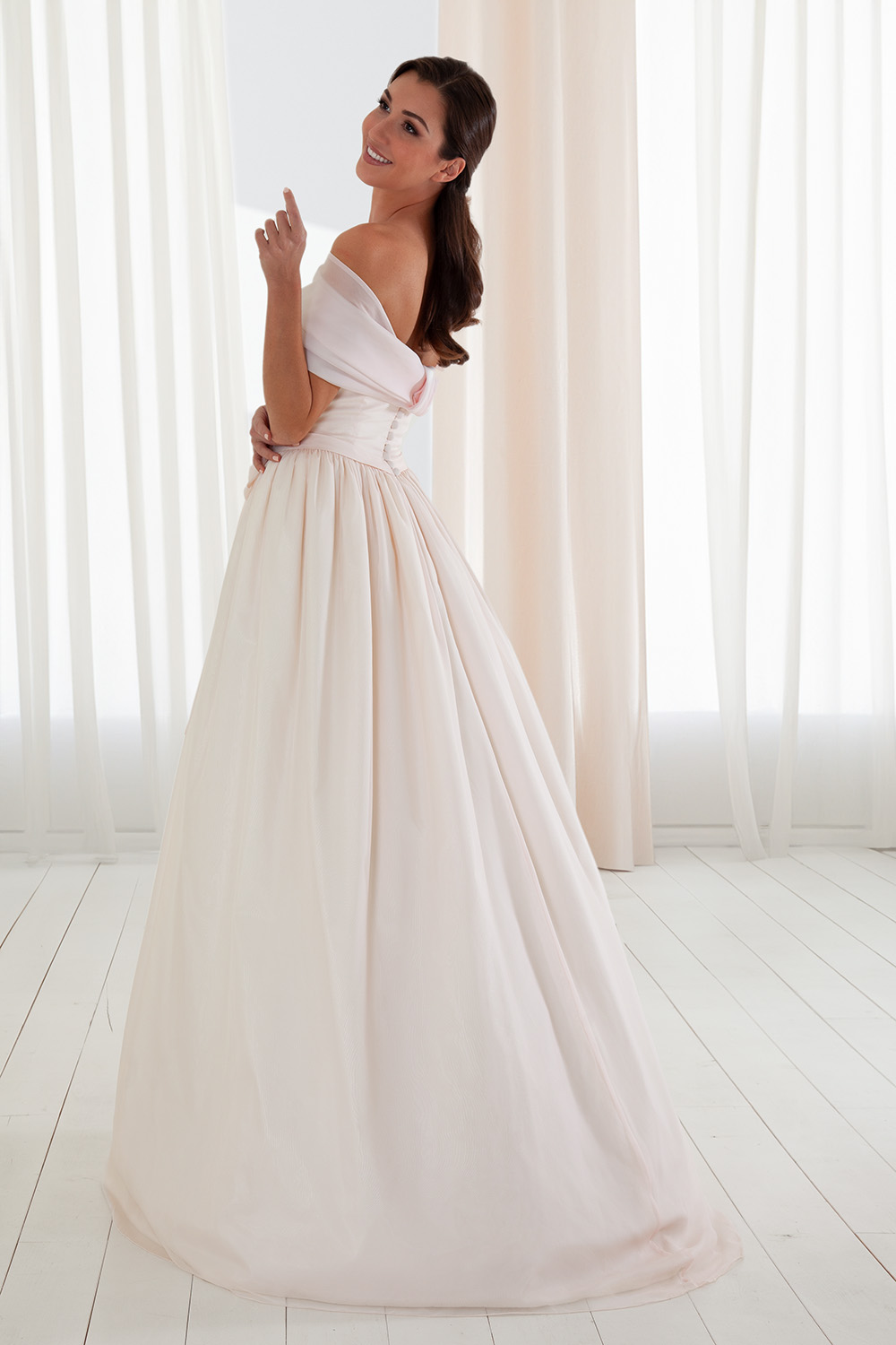 Abito classico in taffetà e chiffon di seta con importante gonna arricciata.