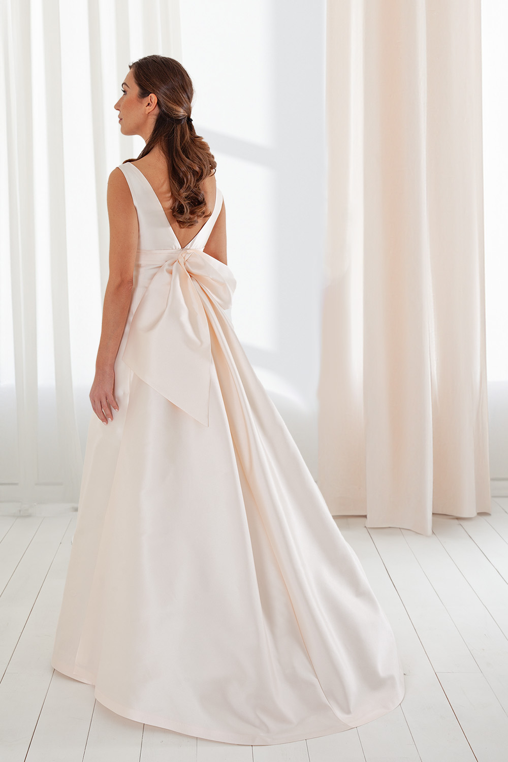 Abito in mikado con scollo a barchetta e profonda scollatura dietro.