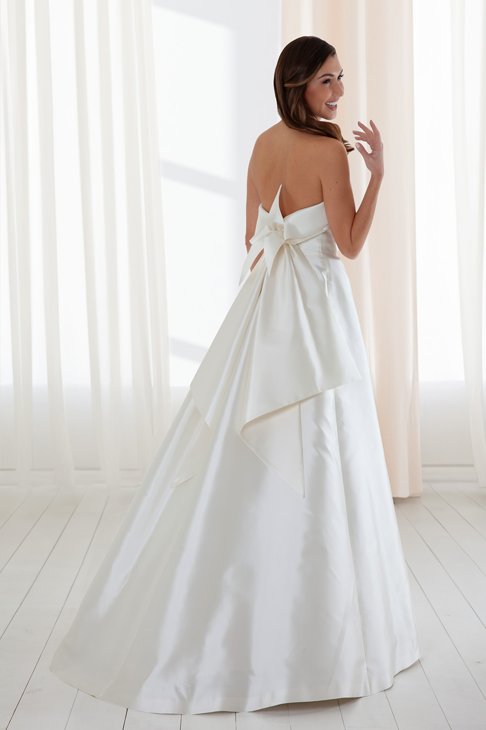 Abito scultura in mikado di seta con profonda scollatura e fiocco dietro.