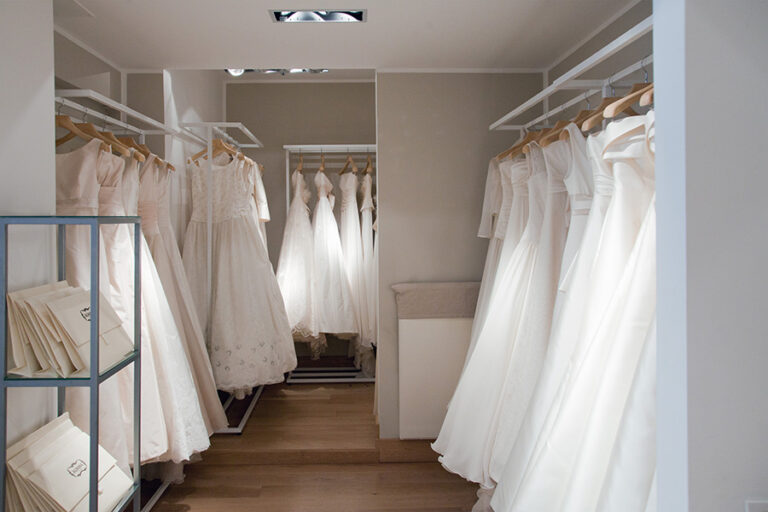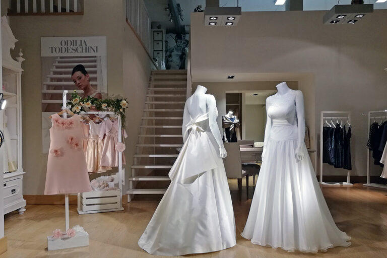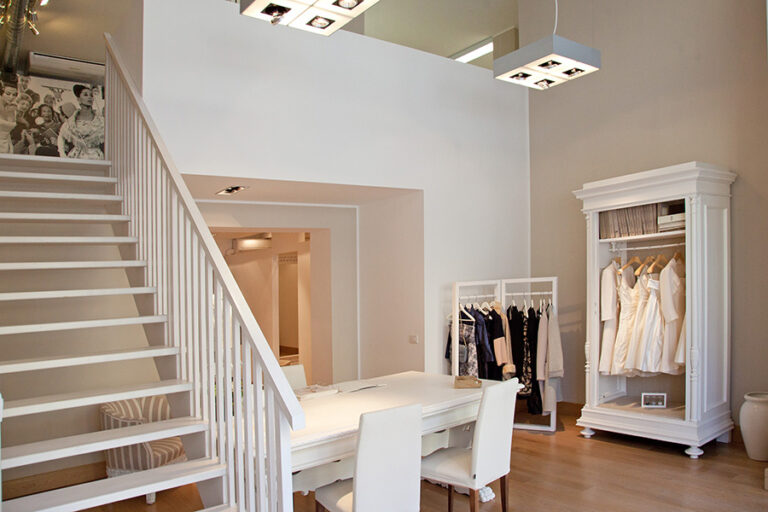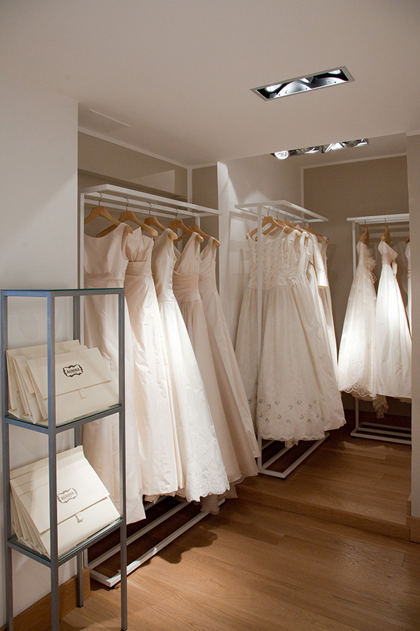 Il layout degli spazi è articolato in un’area di accoglienza, una zona espositiva, un ampio salotto per le prove delle spose ed infine la sartoria al piano superiore.