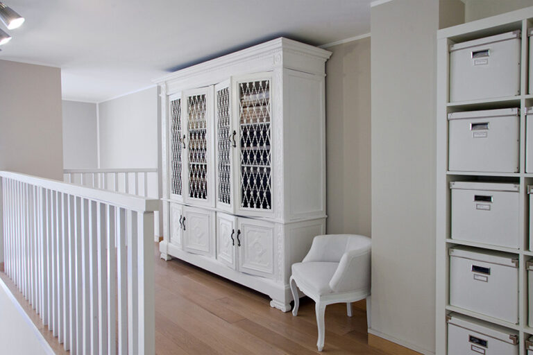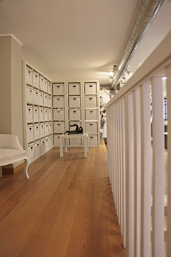 Con un’interpretazione dello stile shabby chic, l’atelier è caratterizzato dal legno bianco di armadi, tavoli, poltrone, scala e travi, dal pavimento in rovere massello nella sua colorazione naturale e dalle calde tonalità di beige e tortora di pareti e tessuti.