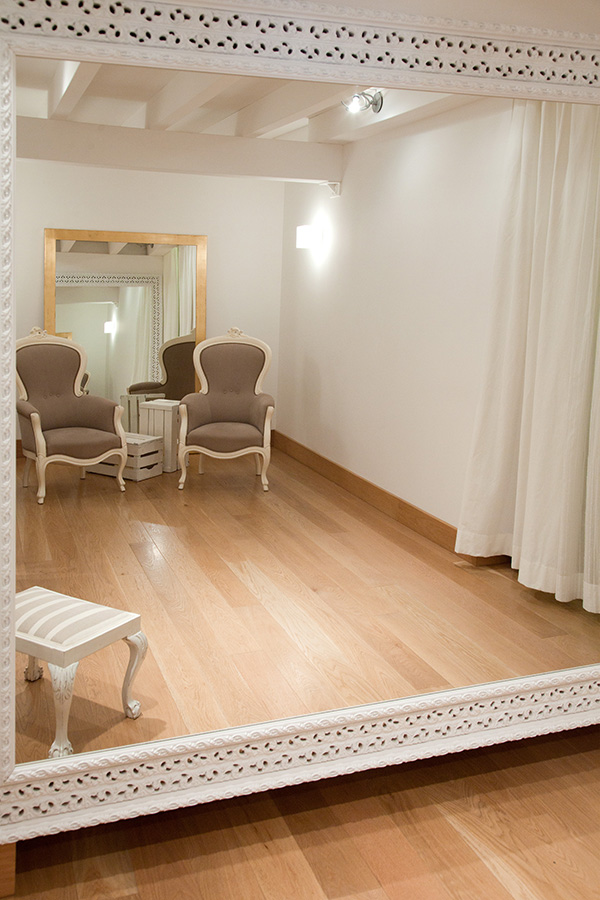 Il salotto per le prove è sovradimensionato, così da offrire la massima accoglienza e comodità alla sposa e alle sue accompagnatrici.